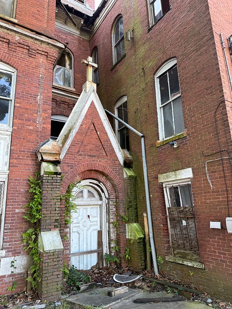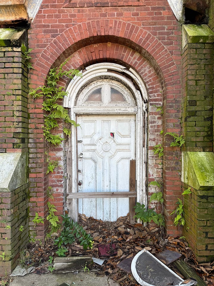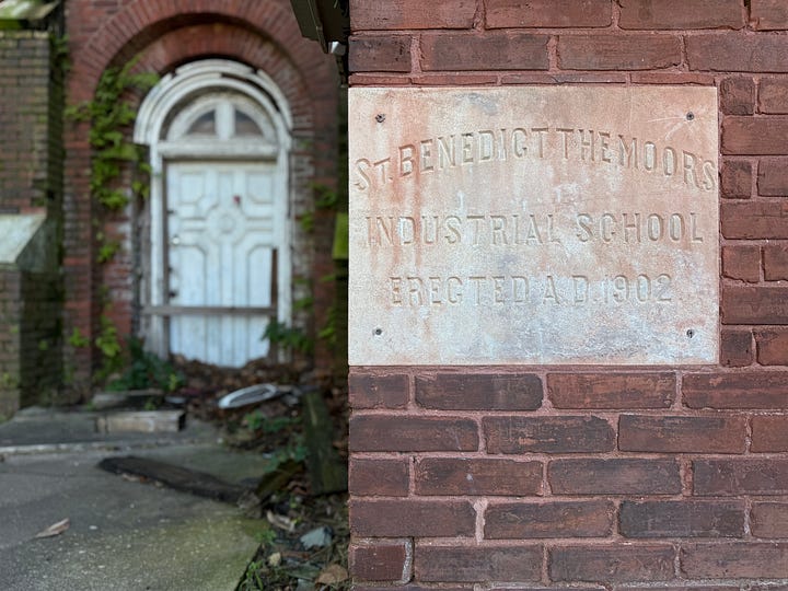 Case in point: the first unintended stop was a dilapidated, vine-encumbered, Victorian-looking brick building not far from where we started this morning. The lawn had been mown recently, which suggests that someone has not entirely given up on this property. As it turns out, the building was erected in 1902 as St. Benedict the Moors Industrial School, in the historically Black Laney-Walker district of Augusta. I’ve encountered Industrial Schools many times, most notably (for me) the Okolona Industrial School in Okolona, Mississippi, founded by Wallace Battle in the same year. But I have never seen one named for a saint, and this is a saint I have never heard of.